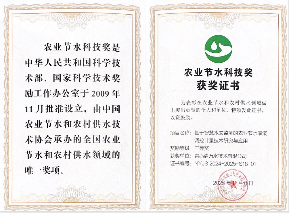 清万水《基于智慧水文监测的农业节水灌溉调控计量技术研究与应用》项目,在此次颁奖大会中荣获三等奖。这一荣誉不仅是对该技术成果的高度认可,更引领着清万水在农业节水数字研发、成果转化及落地应用领域,迈向技术前列。