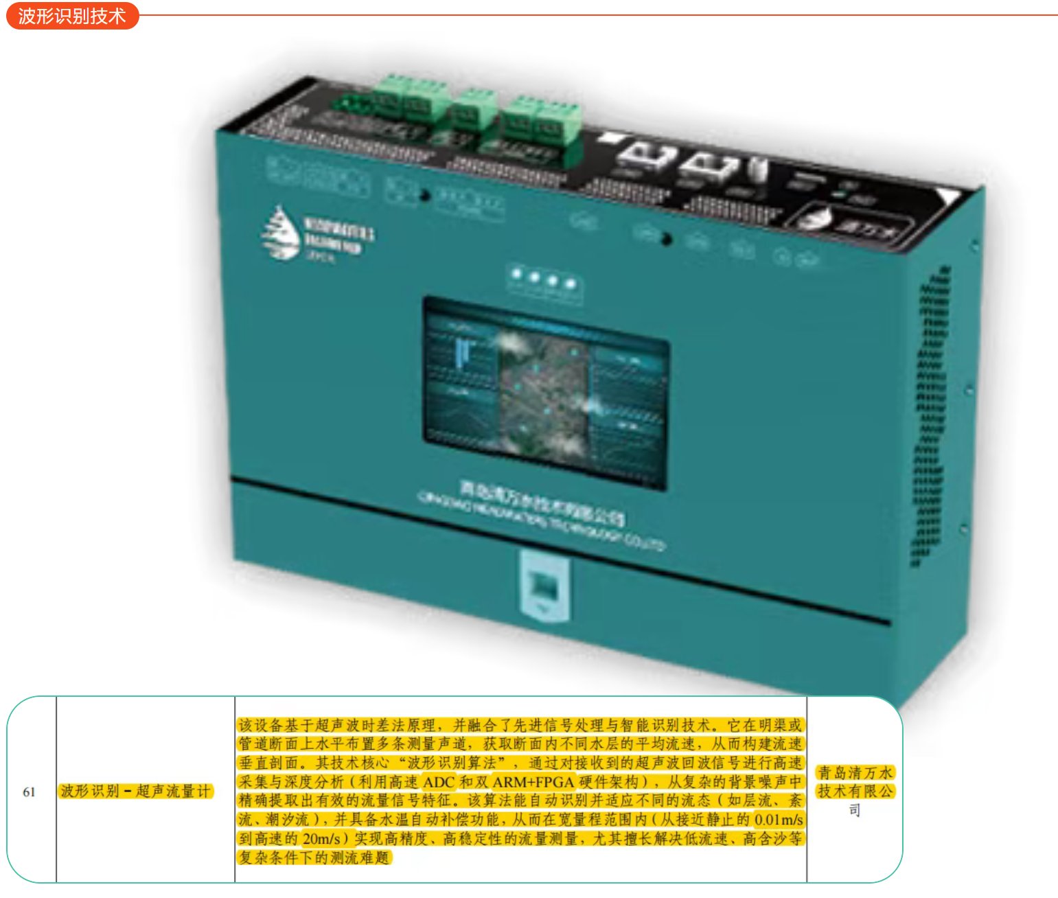 近日,水利部发布《节水先进成熟适用技术设备名录(2025年)》,2025年度共计入选232项节水技术设备,清万水自主研发的波形识别-超声流量计以通用节水技术设备类别成功入选!27年因专注而更加专业,清万水深耕厚植水流量在线监测技术,波形识别技术为超声流量计注入智慧内核。 设备技术简介: 波形识别-超声流量计基于超声波时差法原理,融合了先进信号处理与智能识别技术。该设备在明渠或管道断面上水平布置多条测量声道,获取断面内不同水层的平均流速,从而构建流速垂直剖面。其技术核心“波形识别算法”,通过对接收到的超声波回波信号进行高速采集与深度分析(利用高速ADC和双ARM+FPGA硬件架构),从复杂的背景噪声中精确提取出有效的流量信号特征。该算法能自动识别并适用不同的流态(如层流、紊流、潮汐流),并具备水温自动补偿功能,从而在宽量程范围内(流速从接近静止的0.01m/s到高速的20m/s)实现高精度、高稳定性的流量测量,尤其擅长解决低流速、高含沙等复杂条件下的测流难题。![]()